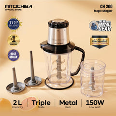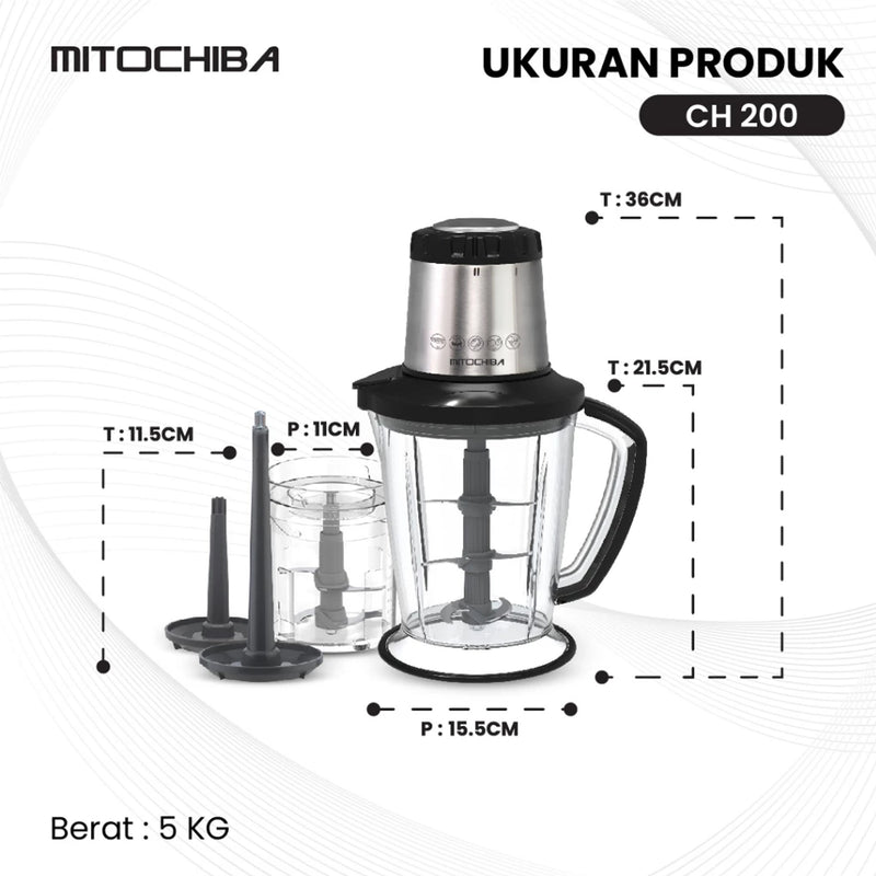 Mitochiba CH-200 adalah chopper multifungsi dengan performa tinggi dan kapasitas besar, ideal untuk berbagai kebutuhan dapur. Dengan jar 2 liter dan mangkuk chopper 700 ml, Sobat bisa mencincang daging, menghaluskan bumbu, mengocok telur, membuat smoothies, hingga serutan es dengan mudah. Ditenagai motor 300 watt dan pisau stainless steel triple blade, hasilnya halus merata dalam waktu singkat.